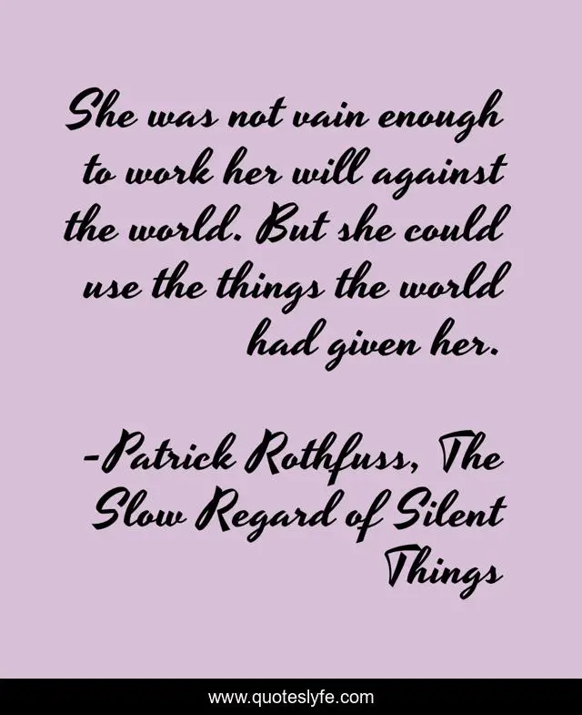 This page presents the quote "She was not vain enough to work her will against the world. But she could use the things the world had given her.". Author of this quote is Patrick Rothfuss, The Slow Regard of Silent Things. This quote is about patience, auri, vanity,.