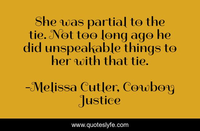 This page presents the quote "She was partial to the tie. Not too long ago he did unspeakable things to her with that tie.". Author of this quote is Melissa Cutler, Cowboy Justice. This quote is about romance, cowboys, western-romance, western, contemporary-romance,.