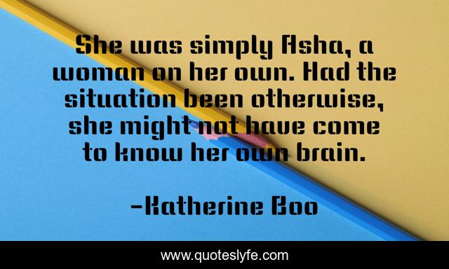 This page presents the quote "She was simply Asha, a woman on her own. Had the situation been otherwise, she might not have come to know her own brain.". Author of this quote is Katherine Boo. This quote is about woman, equality, women-power, power, feminist, womanhood, women-s-rights, equal-rights, feminism-gender,.