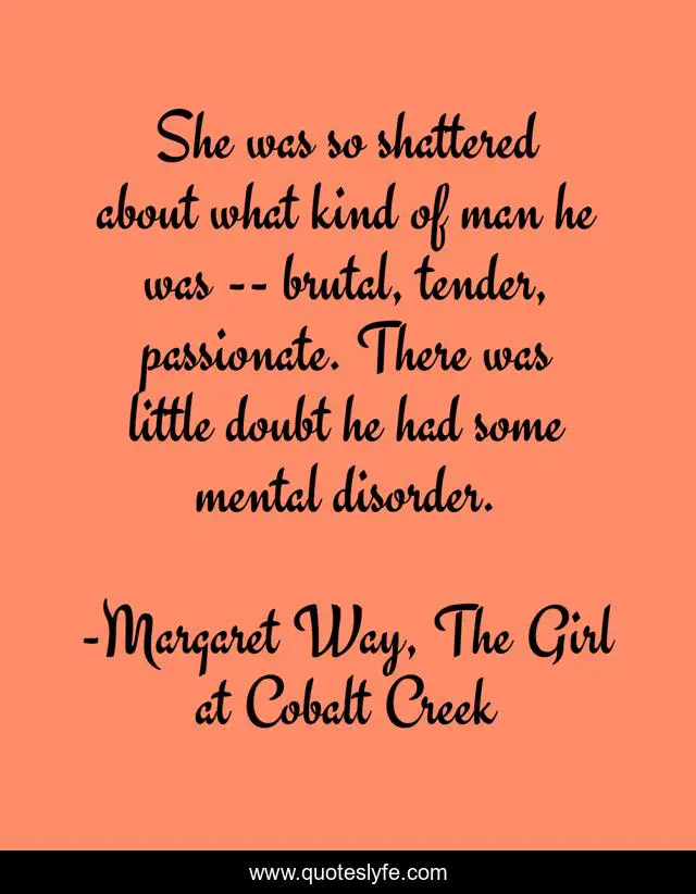 This page presents the quote "She was so shattered about what kind of man he was -- brutal, tender, passionate. There was little doubt he had some mental disorder.". Author of this quote is Margaret Way, The Girl at Cobalt Creek. This quote is about shattered, brutal, passion, mental-disorder, tender, passionate, man,.