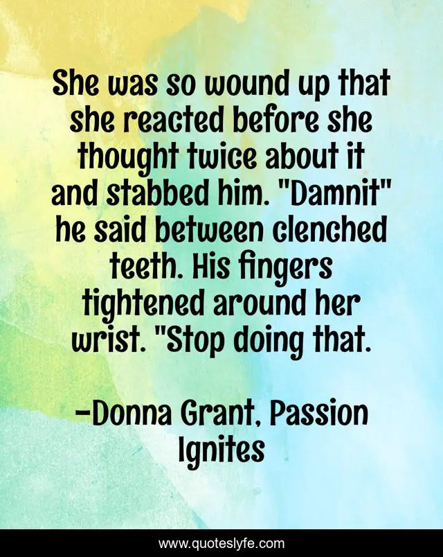 This page presents the quote "She was so wound up that she reacted before she thought twice about it and stabbed him. "Damnit" he said between clenched teeth. His fingers tightened around her wrist. "Stop doing that.". Author of this quote is Donna Grant, Passion Ignites. This quote is about dragon-kings, paranormal-romance,.