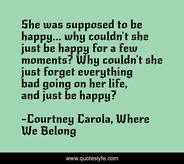 This page presents the quote "She was supposed to be happy... why couldn't she just be happy for a few moments? Why couldn't she just forget everything bad going on her life, and just be happy?". Author of this quote is Courtney Carola, Where We Belong. This quote is about depression, happiness, happy,.