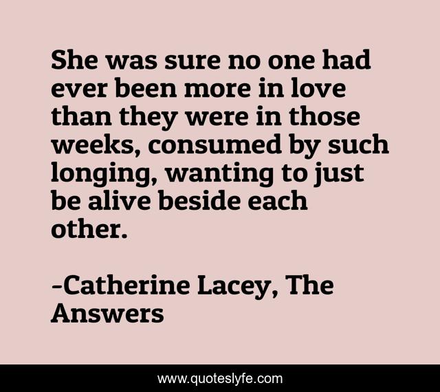 This page presents the quote "She was sure no one had ever been more in love than they were in those weeks, consumed by such longing, wanting to just be alive beside each other.". Author of this quote is Catherine Lacey, The Answers. This quote is about longing, catherine-lacey, the-answers, in-love, relationship,.