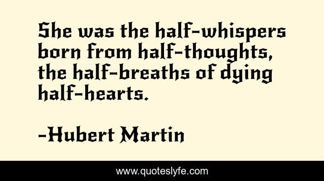 This page presents the quote "She was the half-whispers born from half-thoughts, the half-breaths of dying half-hearts.". Author of this quote is Hubert Martin. This quote is about love, honesty, intelligence, deep, sleep, best, poem, confidence, humor,.