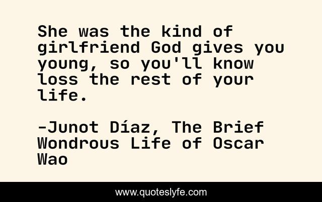 This page presents the quote "She was the kind of girlfriend God gives you young, so you'll know loss the rest of your life.". Author of this quote is Junot Díaz, The Brief Wondrous Life of Oscar Wao. This quote is about loss, love, affection,.