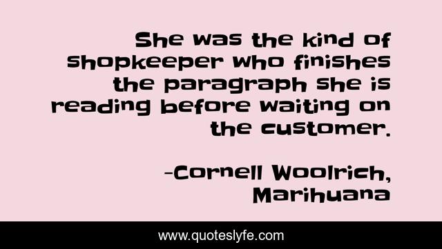 This page presents the quote "She was the kind of shopkeeper who finishes the paragraph she is reading before waiting on the customer.". Author of this quote is Cornell Woolrich, Marihuana. This quote is about shopkeeper, cashiers, cashier, service,.