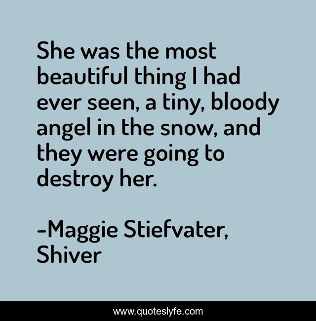 This page presents the quote "She was the most beautiful thing I had ever seen, a tiny, bloody angel in the snow, and they were going to destroy her.". Author of this quote is Maggie Stiefvater, Shiver. This quote is about werewolf, death, winter, angel, snow,.