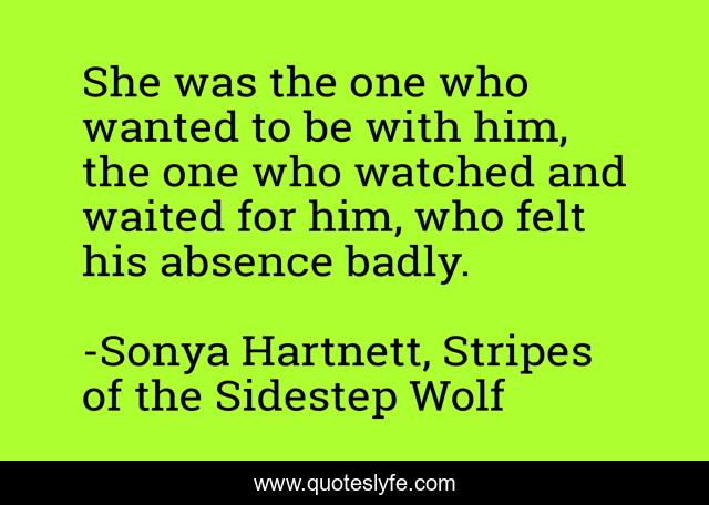 This page presents the quote "She was the one who wanted to be with him, the one who watched and waited for him, who felt his absence badly.". Author of this quote is Sonya Hartnett, Stripes of the Sidestep Wolf. This quote is about dogs, devotion,.