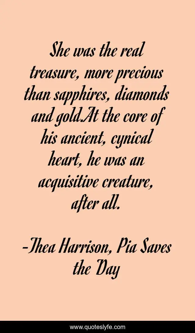 This page presents the quote "She was the real treasure, more precious than sapphires, diamonds and gold.At the core of his ancient, cynical heart, he was an acquisitive creature, after all.". Author of this quote is Thea Harrison, Pia Saves the Day. This quote is about romance, urban-fantasy, paranormal, dragons,.