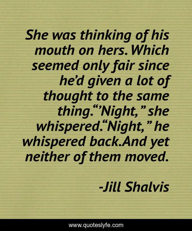 This page presents the quote "She was thinking of his mouth on hers. Which seemed only fair since he’d given a lot of thought to the same thing.“’Night, ” she whispered.“Night, ” he whispered back.And yet neither of them moved.". Author of this quote is Jill Shalvis. This quote is about sweet-little-lies, love, contemporary-romance, affection, love-and-sayings,.