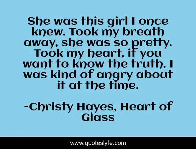 This page presents the quote "She was this girl I once knew. Took my breath away, she was so pretty. Took my heart, if you want to know the truth. I was kind of angry about it at the time.". Author of this quote is Christy Hayes, Heart of Glass. This quote is about falling-in-love, love, heartbreak, affection,.