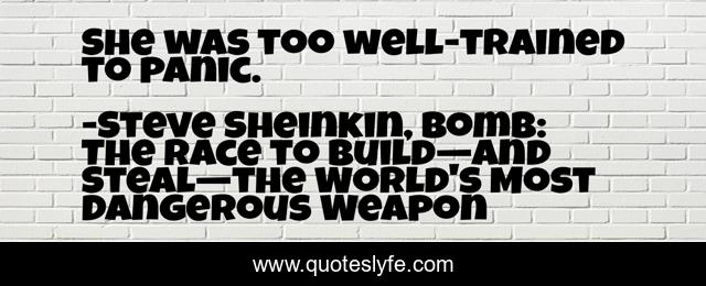 This page presents the quote "She was too well-trained to panic.". Author of this quote is Steve Sheinkin, Bomb: The Race to Build—and Steal—the World's Most Dangerous Weapon. This quote is about emotion, anxiety, priorities, maturation, routine, discipleship, self-discipline, education, worry,.