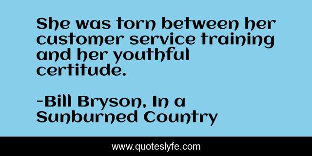 This page presents the quote "She was torn between her customer service training and her youthful certitude.". Author of this quote is Bill Bryson, In a Sunburned Country. This quote is about maturation, culture, graciousness, education, humility,.
