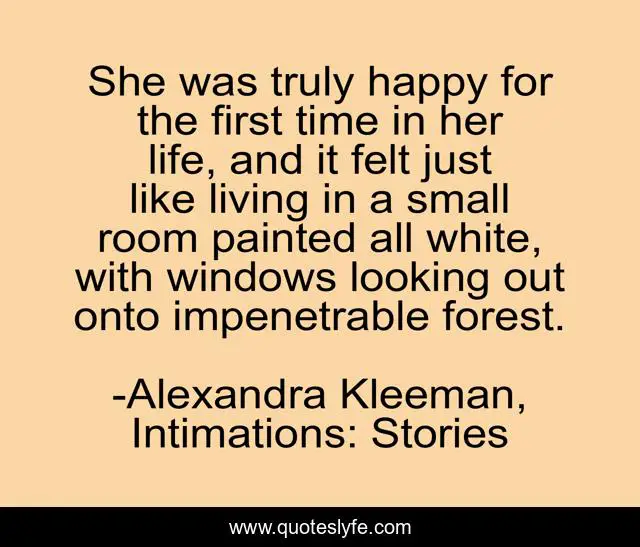 This page presents the quote "She was truly happy for the first time in her life, and it felt just like living in a small room painted all white, with windows looking out onto impenetrable forest.". Author of this quote is Alexandra Kleeman, Intimations: Stories. This quote is about simile, alexandra-kleeman, intimations, descriptive, happy,.