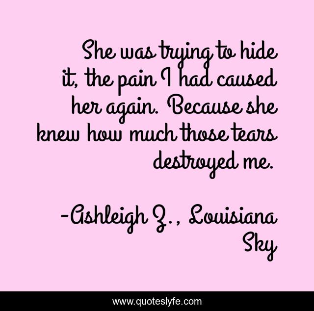 This page presents the quote "She was trying to hide it, the pain I had caused her again. Because she knew how much those tears destroyed me.". Author of this quote is Ashleigh Z., Louisiana Sky. This quote is about broken-heart, love, alcoholism, affection, reunited-lovers,.