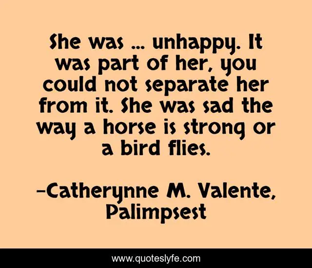 This page presents the quote "She was ... unhappy. It was part of her, you could not separate her from it. She was sad the way a horse is strong or a bird flies.". Author of this quote is Catherynne M. Valente, Palimpsest. .
