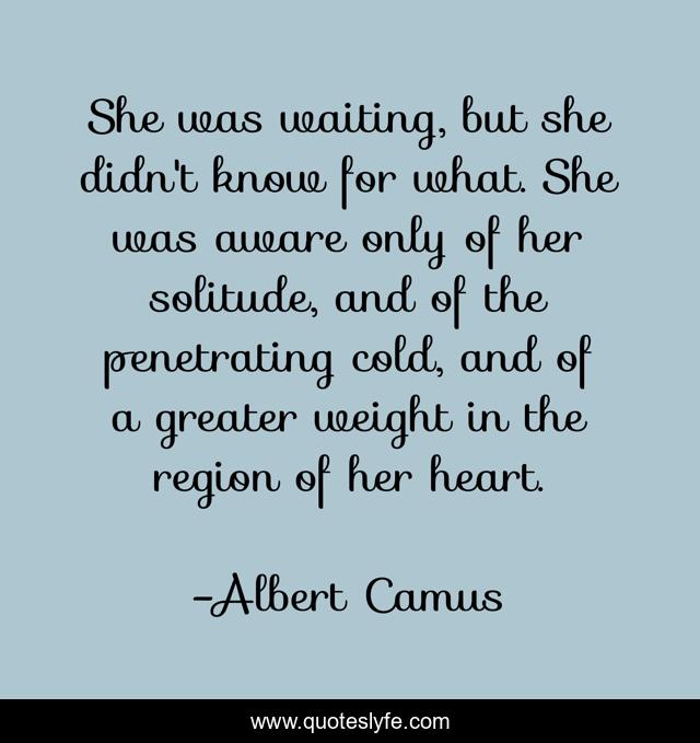 This page presents the quote "She was waiting, but she didn't know for what. She was aware only of her solitude, and of the penetrating cold, and of a greater weight in the region of her heart.". Author of this quote is Albert Camus. This quote is about solitude, loneliness, the-adulterous-woman, thoughts, fiction,.
