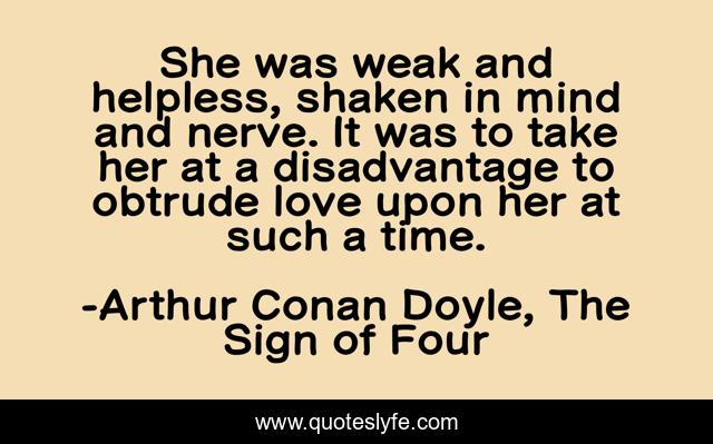 This page presents the quote "She was weak and helpless, shaken in mind and nerve. It was to take her at a disadvantage to obtrude love upon her at such a time.". Author of this quote is Arthur Conan Doyle, The Sign of Four. This quote is about romance, wealth, morality,.