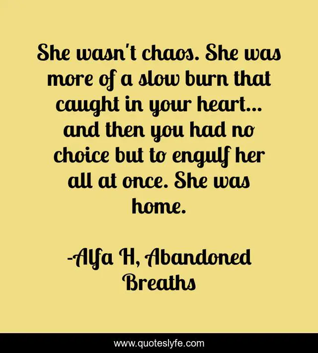 This page presents the quote "She wasn't chaos. She was more of a slow burn that caught in your heart... and then you had no choice but to engulf her all at once. She was home.". Author of this quote is Alfa H, Abandoned Breaths. This quote is about relationships, love, poetry, affection,.