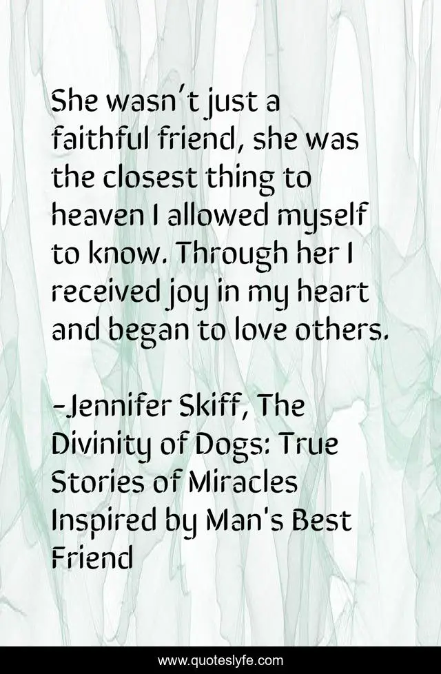 This page presents the quote "She wasn’t just a faithful friend, she was the closest thing to heaven I allowed myself to know. Through her I received joy in my heart and began to love others.". Author of this quote is Jennifer Skiff, The Divinity of Dogs: True Stories of Miracles Inspired by Man's Best Friend. This quote is about heaven, faithfulness, faithful, joyfulness, joy, love, friendship, affection,.