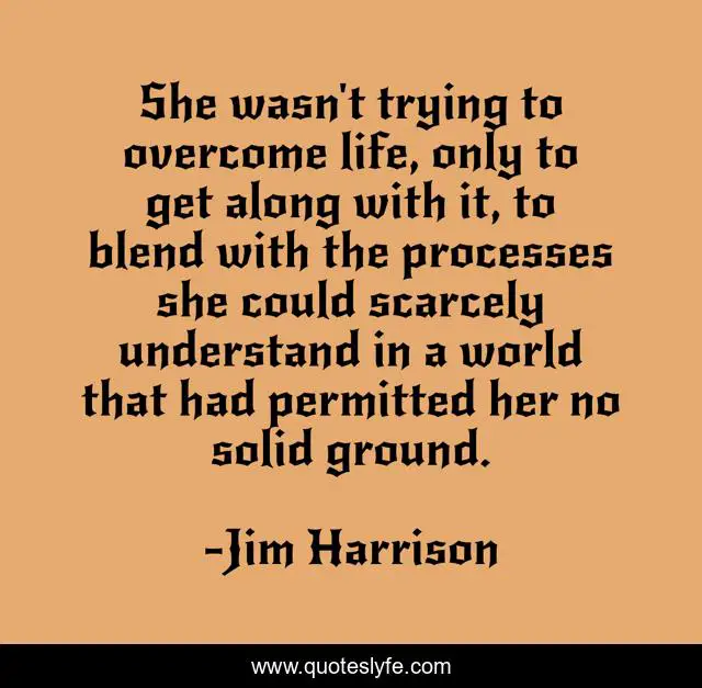 This page presents the quote "She wasn't trying to overcome life, only to get along with it, to blend with the processes she could scarcely understand in a world that had permitted her no solid ground.". Author of this quote is Jim Harrison. .