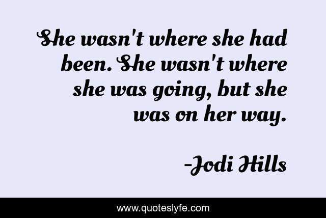 This page presents the quote "She wasn't where she had been. She wasn't where she was going, but she was on her way.". Author of this quote is Jodi Hills. This quote is about on-my-way, life, on-her-way, travel, going-places, experience, journey, adventure, learning,.