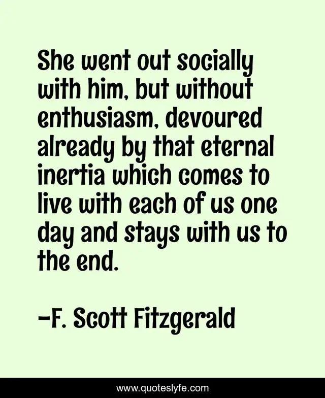 This page presents the quote "She went out socially with him, but without enthusiasm, devoured already by that eternal inertia which comes to live with each of us one day and stays with us to the end.". Author of this quote is F. Scott Fitzgerald. .
