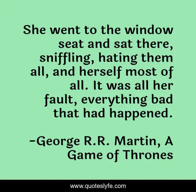 This page presents the quote "She went to the window seat and sat there, sniffling, hating them all, and herself most of all. It was all her fault, everything bad that had happened.". Author of this quote is George R.R. Martin, A Game of Thrones. This quote is about arya-stark, guilt, depression,.