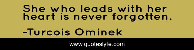 This page presents the quote "She who leads with her heart is never forgotten.". Author of this quote is Turcois Ominek. This quote is about heart, strength, women-s-rights, truth, history, women,.