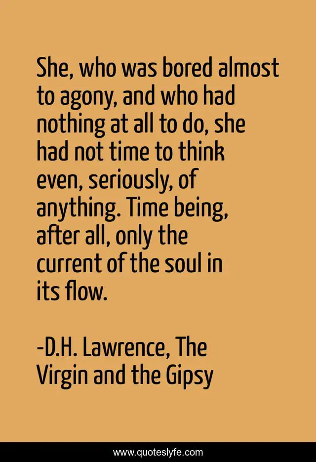 This page presents the quote "She, who was bored almost to agony, and who had nothing at all to do, she had not time to think even, seriously, of anything. Time being, after all, only the current of the soul in its flow.". Author of this quote is D.H. Lawrence, The Virgin and the Gipsy. This quote is about boredom, soul, time,.