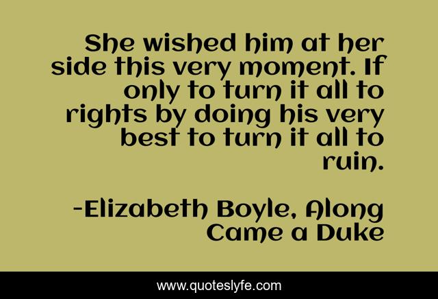 This page presents the quote "She wished him at her side this very moment. If only to turn it all to rights by doing his very best to turn it all to ruin.". Author of this quote is Elizabeth Boyle, Along Came a Duke. This quote is about romance, love, historical-romance, affection,.