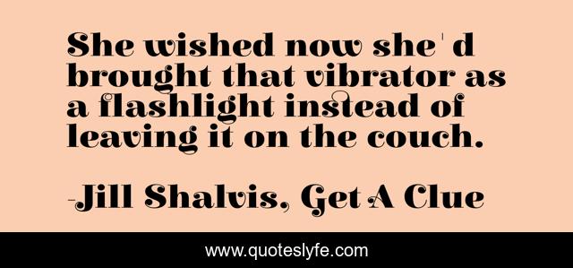 This page presents the quote "She wished now she'd brought that vibrator as a flashlight instead of leaving it on the couch.". Author of this quote is Jill Shalvis, Get A Clue. This quote is about ex-cop, snow, who-done-it, romantic-suspense, romantic-comedy, quirky-characters,.