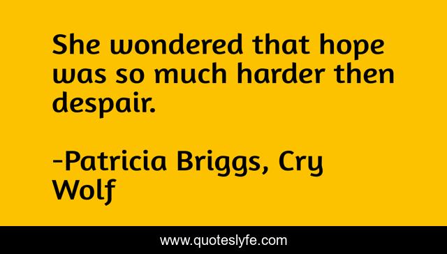 This page presents the quote "She wondered that hope was so much harder then despair.". Author of this quote is Patricia Briggs, Cry Wolf. This quote is about despair, depression, hope, loss-of-faith,.
