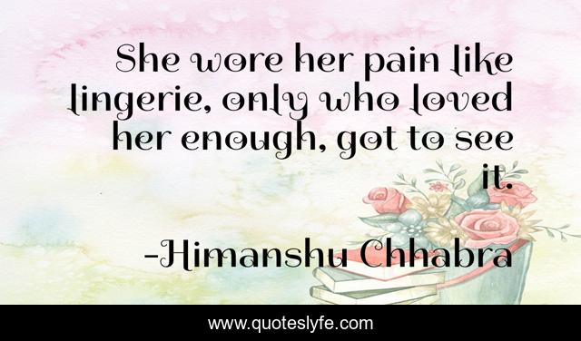 This page presents the quote "She wore her pain like lingerie, only who loved her enough, got to see it.". Author of this quote is Himanshu Chhabra. This quote is about love, romantic, romance, lingerie, metaphor, erotica, pain, affection,.