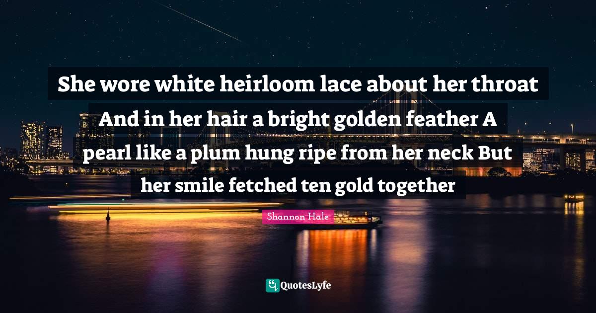 This page presents the quote "She wore white heirloom lace about her throat And in her hair a bright golden feather A pearl like a plum hung ripe from her neck But her smile fetched ten gold together". Author of this quote is Shannon Hale. This quote is about hung, ten, hair, golden, white, together, ripe, lace, her smile,.