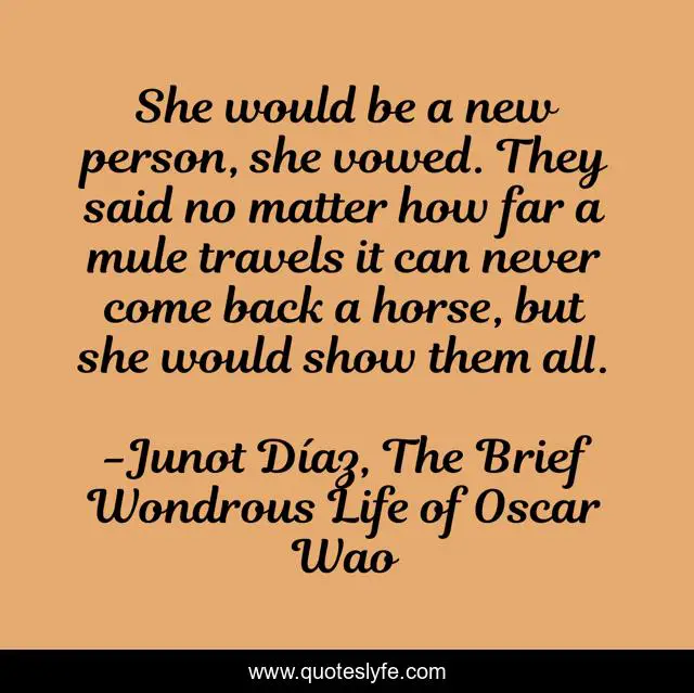 This page presents the quote "She would be a new person, she vowed. They said no matter how far a mule travels it can never come back a horse, but she would show them all.". Author of this quote is Junot Díaz, The Brief Wondrous Life of Oscar Wao. This quote is about self-improvement, change,.