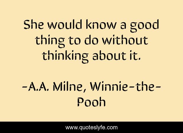 This page presents the quote "She would know a good thing to do without thinking about it.". Author of this quote is A.A. Milne, Winnie-the-Pooh. This quote is about self-discipline, discipleship, habit,.