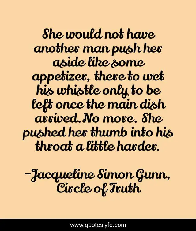 This page presents the quote "She would not have another man push her aside like some appetizer, there to wet his whistle only to be left once the main dish arrived.No more. She pushed her thumb into his throat a little harder.". Author of this quote is Jacqueline Simon Gunn, Circle of Truth. This quote is about psychological-suspense, romantic-thriller, mystery-suspense, psychological-thriller, romantic-suspense, mystery-series, mystery-thriller,.