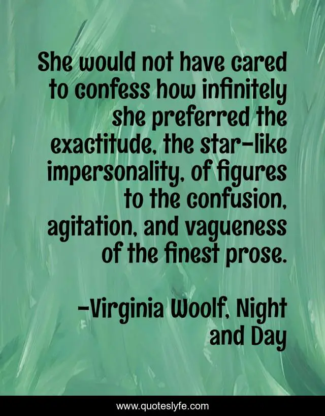 This page presents the quote "She would not have cared to confess how infinitely she preferred the exactitude, the star-like impersonality, of figures to the confusion, agitation, and vagueness of the finest prose.". Author of this quote is Virginia Woolf, Night and Day. This quote is about prose, mathematics, literature,.