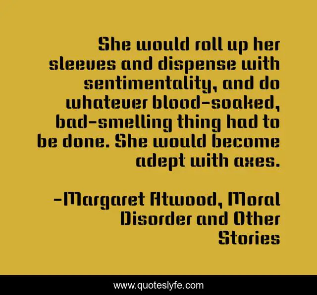 This page presents the quote "She would roll up her sleeves and dispense with sentimentality, and do whatever blood-soaked, bad-smelling thing had to be done. She would become adept with axes.". Author of this quote is Margaret Atwood, Moral Disorder and Other Stories. This quote is about sentimentality, axes, blood,.