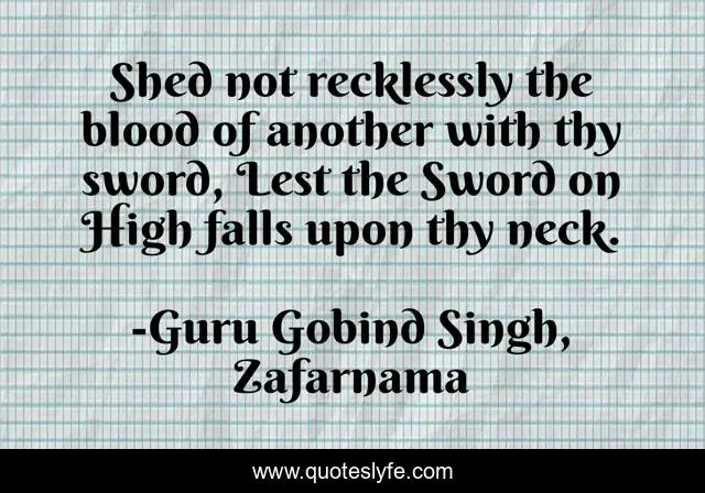 This page presents the quote "Shed not recklessly the blood of another with thy sword, Lest the Sword on High falls upon thy neck.". Author of this quote is Guru Gobind Singh, Zafarnama. This quote is about justice, god, blood, religion,.