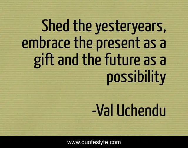 This page presents the quote "Shed the yesteryears, embrace the present as a gift and the future as a possibility". Author of this quote is Val Uchendu. This quote is about gifts, future, present,.
