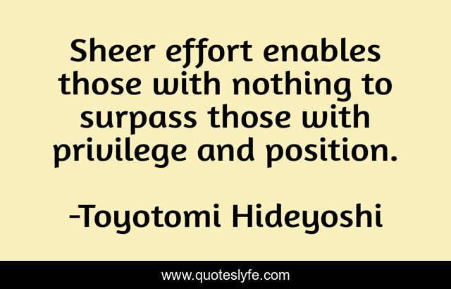 This page presents the quote "Sheer effort enables those with nothing to surpass those with privilege and position.". Author of this quote is Toyotomi Hideyoshi. This quote is about hard-work, japanese, work-ethic, work-ethics, privilege, position, effort, inspiration,.