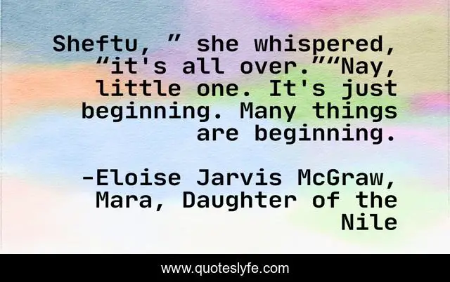 This page presents the quote "Sheftu, ” she whispered, “it's all over.”“Nay, little one. It's just beginning. Many things are beginning.". Author of this quote is Eloise Jarvis McGraw, Mara, Daughter of the Nile. This quote is about egypt, mara-daughter-of-the-nile, historical-fiction,.
