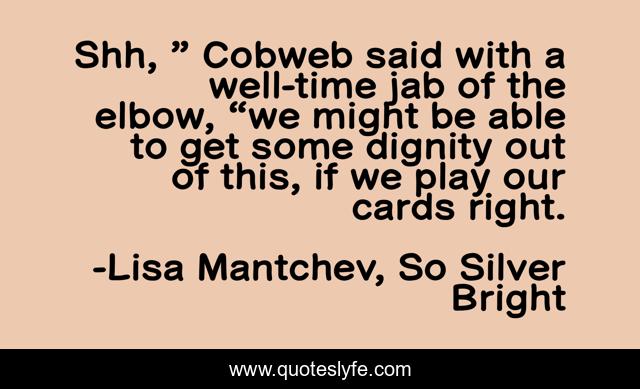 This page presents the quote "Shh, ” Cobweb said with a well-time jab of the elbow, “we might be able to get some dignity out of this, if we play our cards right.". Author of this quote is Lisa Mantchev, So Silver Bright. .