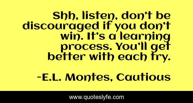 This page presents the quote "Shh, listen, don’t be discouraged if you don’t win. It’s a learning process. You’ll get better with each try.". Author of this quote is E.L. Montes, Cautious. This quote is about trying, experience, learning-process,.