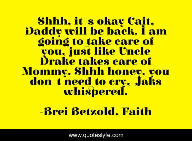 This page presents the quote "Shhh, it's okay Cait, Daddy will be back. I am going to take care of you, just like Uncle Drake takes care of Mommy. Shhh honey, you don't need to cry, "Jaks whispered.". Author of this quote is Brei Betzold, Faith. This quote is about ya, humor, love, affection, music,.