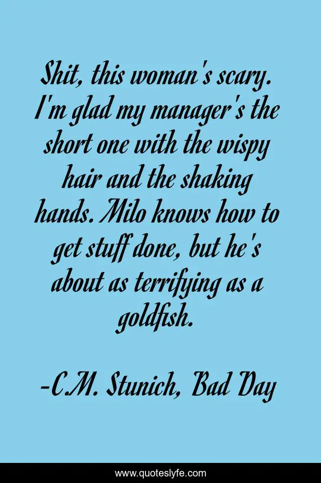 This page presents the quote "Shit, this woman's scary. I'm glad my manager's the short one with the wispy hair and the shaking hands. Milo knows how to get stuff done, but he's about as terrifying as a goldfish.". Author of this quote is C.M. Stunich, Bad Day. .