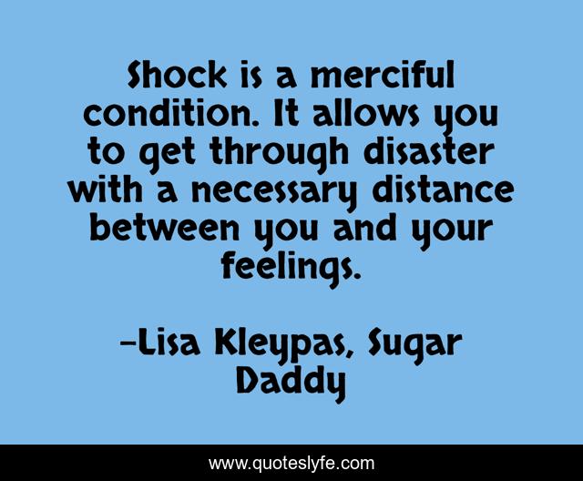 This page presents the quote "Shock is a merciful condition. It allows you to get through disaster with a necessary distance between you and your feelings.". Author of this quote is Lisa Kleypas, Sugar Daddy. This quote is about grief, life,.