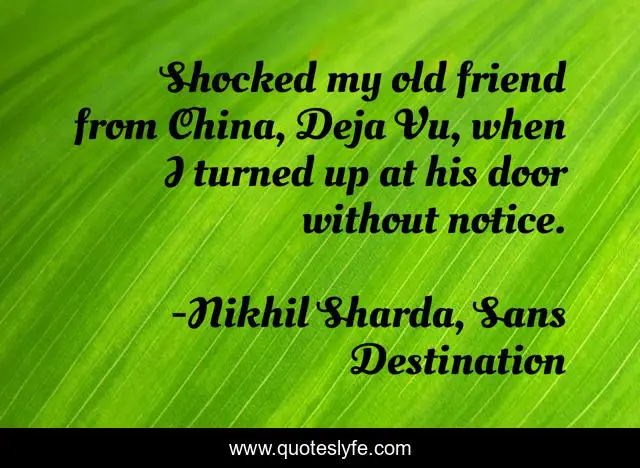 "Nikhil Sharda, Sans Destination Quotes." Quoteslyfe.com, 2025. Sat. 06 Dec. 2025. <https://www.quoteslyfe.com/quote/Shocked-my-old-friend-from-China-Deja-101241>.